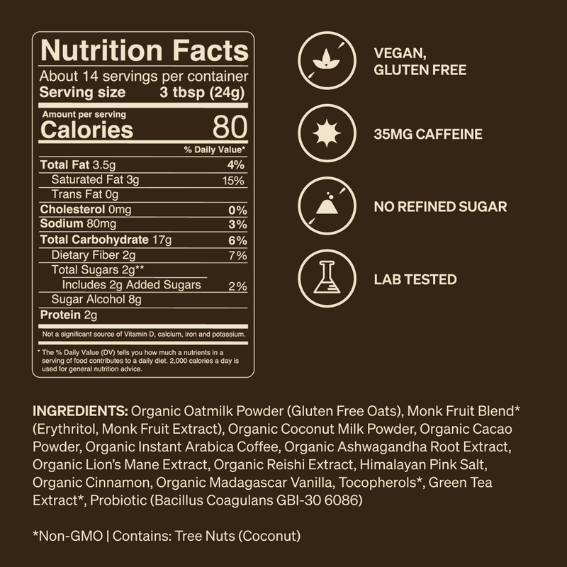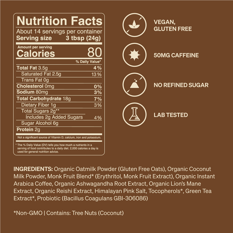 Our lattes froth like a coffee shop latte, thanks to our signature blend of oat milk and coconut creamer already in the mix - We include clinically backed dosages of functional ingredients in each blend - so you can be sure each blend is painstakingly researched. No B.S.