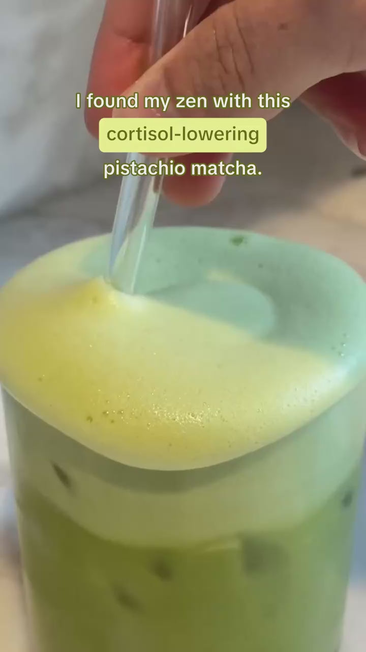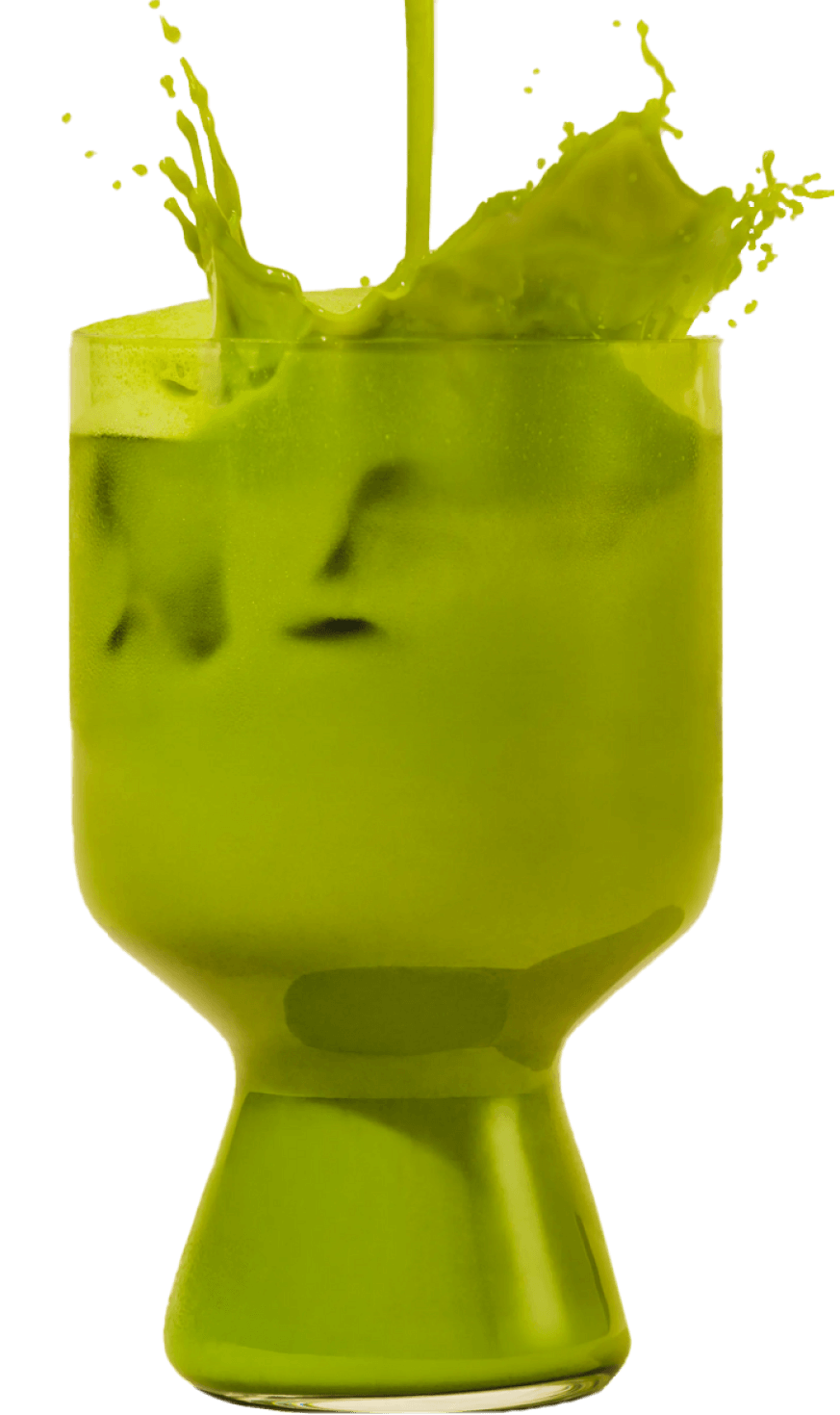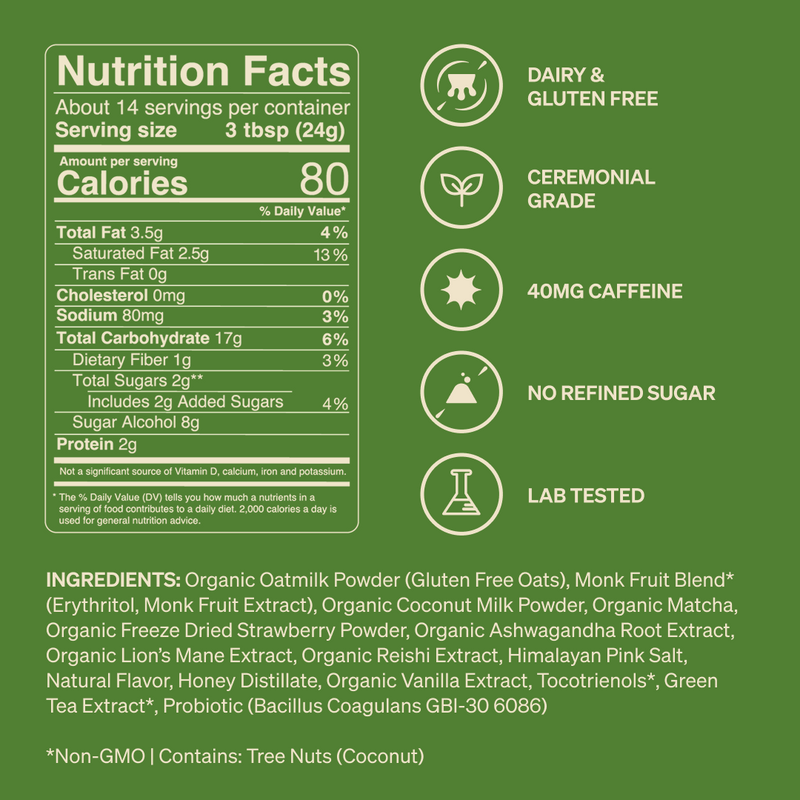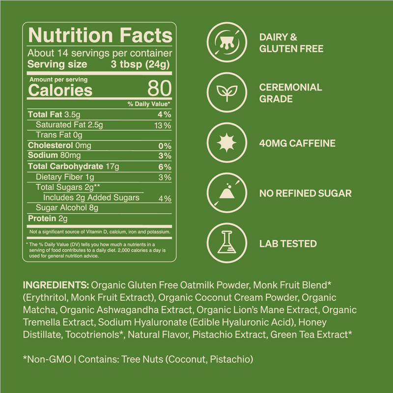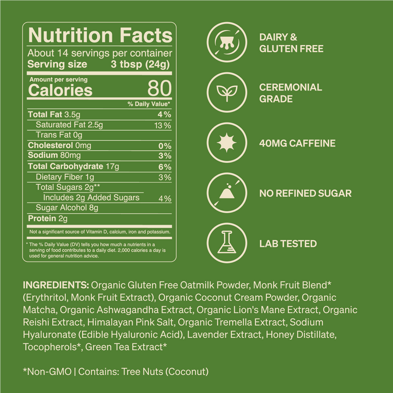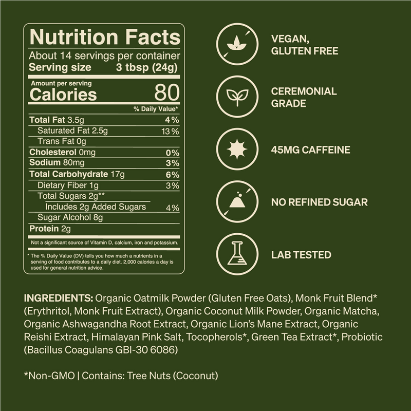 Smooth ceremonial matcha latte with balancing mushrooms.