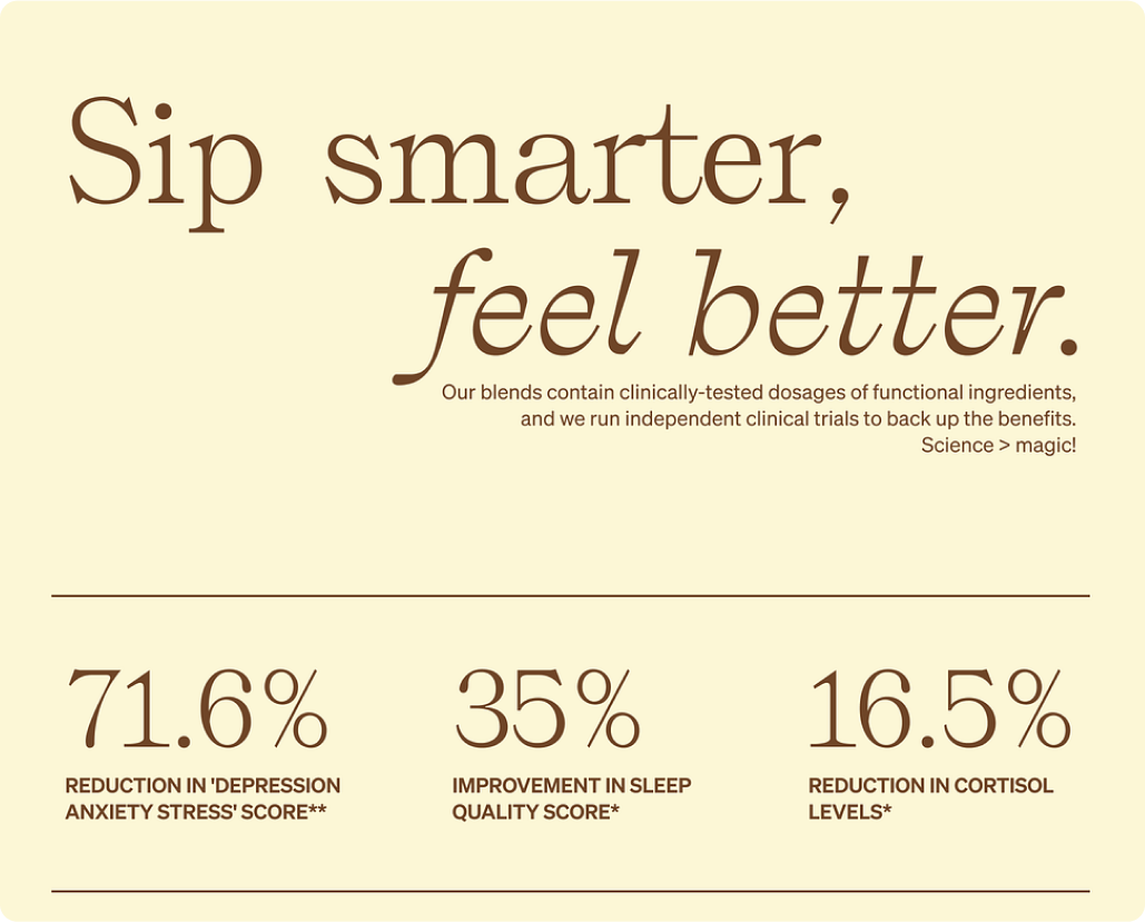 Our blends contain clinically-tested dosages of functional ingredients. We run independent clinical trials to back up the benefits. Science > magic!